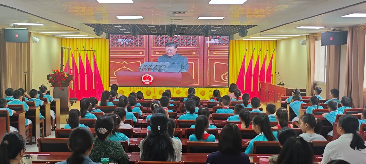 致敬伟大胜利,争做强国少年。9月3日,为纪念中国人民抗日战争暨世界反法西斯战争胜利80周年,学校组织全校师生共同观看这场盛大的阅兵活动直播,共同感受国家的强大与民族的自豪。整齐划一的徒步方队、身姿挺拔、气势如虹的中国军人,引得师生们阵阵赞叹。学生们专注地盯着屏幕,眼神中充满敬佩与向往。“解放军叔叔们太帅了,他们的步伐好整齐,我以后也要像他们一样,保家卫国!”一名低年级学生兴奋地说道。观看结束后,褚卫军书记为同学们上了一堂生动的思政课,与同学们进行交流分享。同学们纷纷表示,这次阅兵让他们深受触动,更加明白了和平的来之不易,今后要努力学习,为实现中华民族伟大复兴的中国梦贡献自己的力量。老师们也表示,会将此次阅兵所传递的精神融入到教学中,培养学生的爱国情怀和社会责任感。