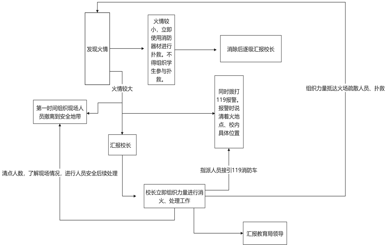 校长接到汇报后立即组织力量赶赴现场处置,做好三点工作:一是组织力量进行人员疏散,二是组织力量进行火情扑救,三是派出人员引导消防车辆快速到达着火地点。